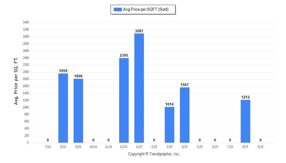 The Average Sold Price per Square Footage is a great indicator for the direction of property values. Since Median Sold Price and Average Sold Price can be impacted by the 'mix' of high or low end properties in the market, the Average Sold Price per Square Footage is a more normalized indicator on the direction of property values. The September 2025 Average Sold Price per Square Footage of $0 was down 100% from $1,212 last month and down 100% from $1,806 in September of last year.