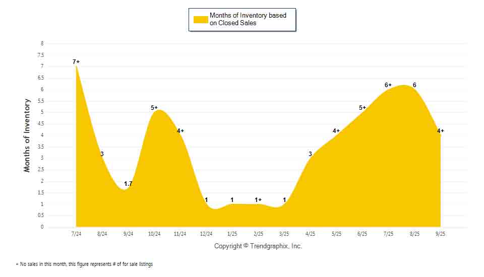 The September 2025 Months of Inventory based on Closed Sales of 4 was increased by 138% compared to last year and down 33.3% compared to last month. September 2025 was Neutral market.