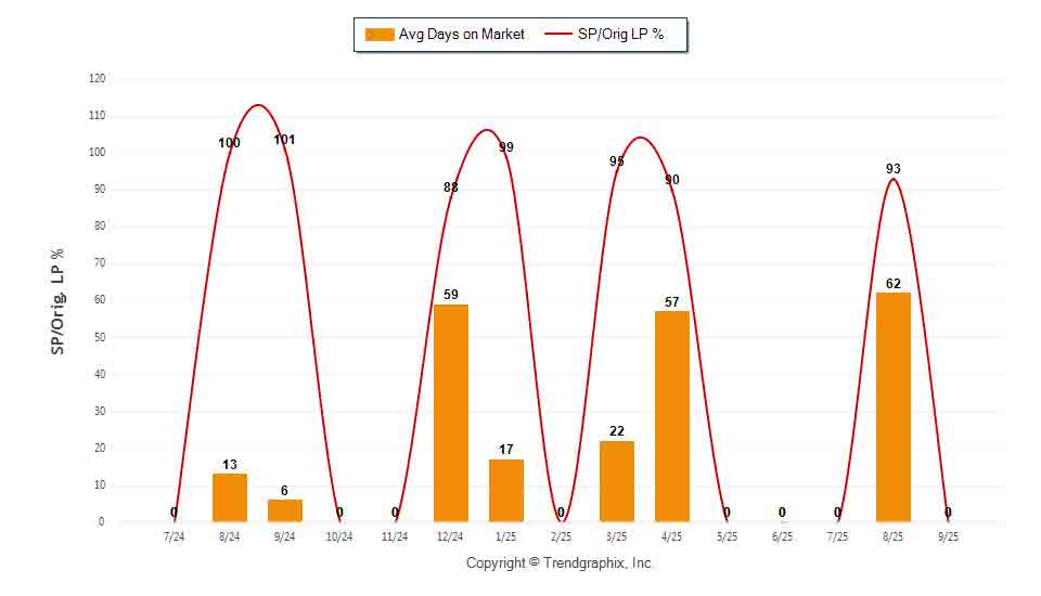 The average Days on Market (DOM) shows how many days the average property is on the market before it sells. An upward trend in DOM trends to indicate a move towards more of a Buyer’s market, a downward trend indicates a move towards more of a Seller’s market. The DOM for September 2025 was 0, down 100% from 62 days last month and down 100% from 6 days in September of last year.